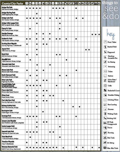 Langlade County's 23 parks provide residents and visitors a wide range of facilities perfect for your next day at the park. From picnic tables and grills to swimming areas and hiking paths, you are sure to have a great time in any of Langlade County's Parks. See the list below for the available facilities listed by park name.